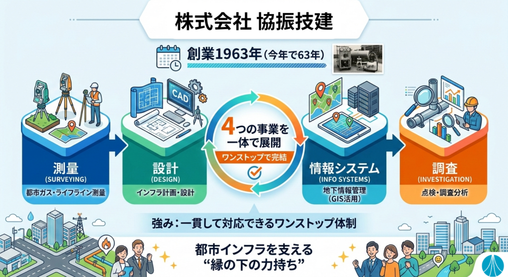 今回、AGO MARKETINGがAI導入のサポートをさせていただいた株式会社協振技建様は、1963年(昭和38年)創業。60年以上にわたり、日本の都市インフラを支え続けてきた歴史ある企業です。